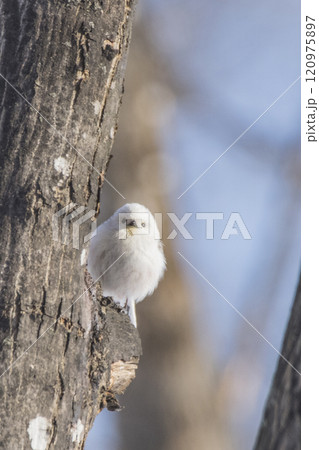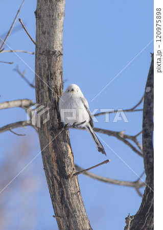 冬の北海道で木の枝に止まるシマエナガ