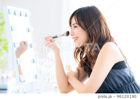 鏡を見ながらセルフメイクをする若い女性 ビューティー イメージ