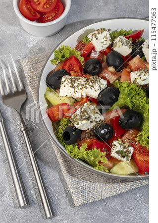Traditional greek salad with fresh ingredients, feta cheese, olives, red tomatoes, cucumbers and greens