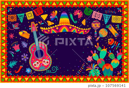 Mexican holiday frame with Tex Mex cuisine and musical instruments, vector background. Mexican guitar and maracas with traditional fiesta food, tequila and papel picado flags for Dia de Los Muertos