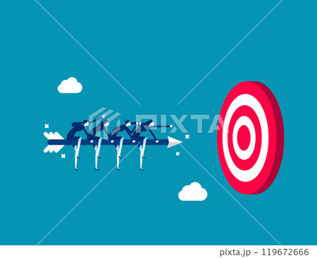 Teamwork aiming for target, business goal or achievement, focus on goal, objective or purpose, company direction or collaboration partner concept, business people team riding arrow to hit bullseye.