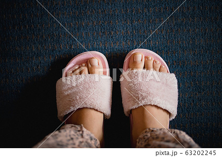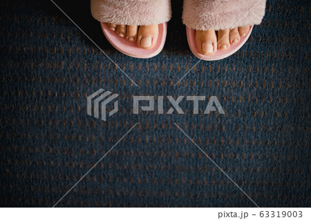 female legs with a pedicure in pink fluffy slippers on a dark blue carpet background. Copy space