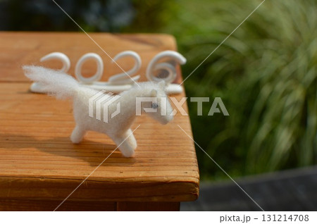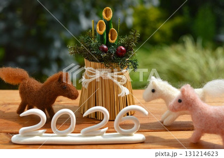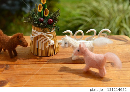 羊毛フェルトの馬が鏡もちに集まる年賀素材