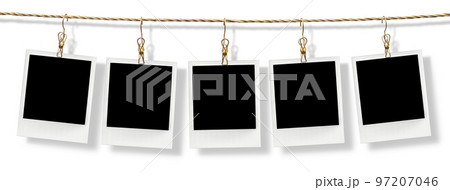 クリップで吊り下げられた空白の写真フレームの背景テクスチャー