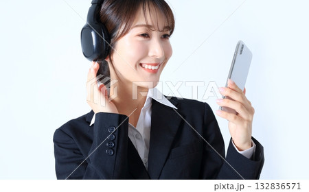 白バックの前でスマホを操作するスーツを着た笑顔のビジネスウーマン