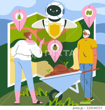 Vector illustration of a robot helping farmers identify and manage pests. Two individuals discuss strategies with the aid of a high-tech robotic assistant on a farm.