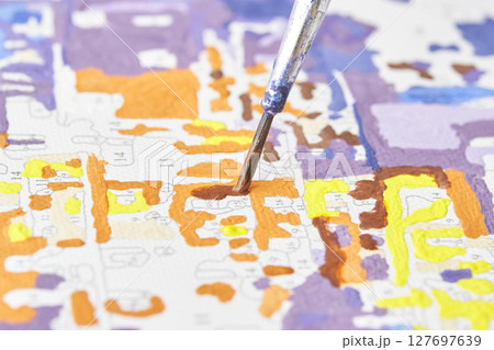 Close up of paintbrush on colorful paint by number canvas in creative artistic