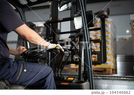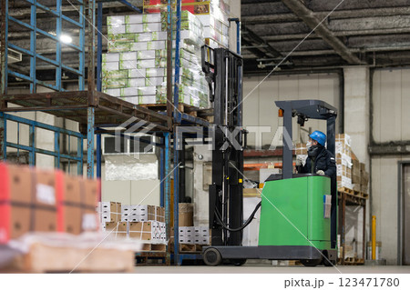 フォークリフトで荷物を積み下ろしている作業服の男性
