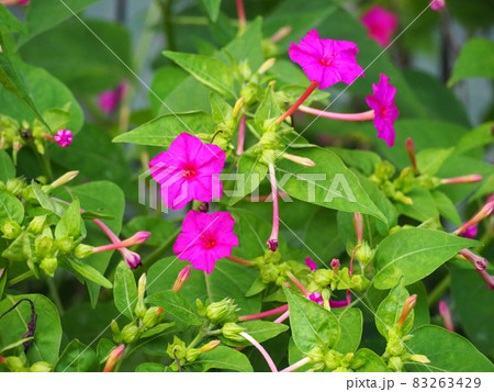 夏の庭に咲く濃いピンク色のオシロイバナ