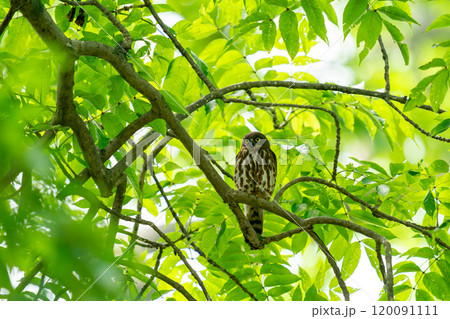 巣の近くの木にとまってあたりの様子を伺っているアオバズク