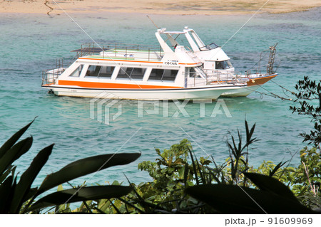 石垣島 フサキビーチより海上保安庁の巡視船とグラスボートを望む