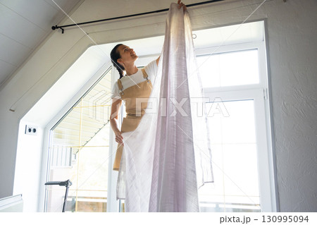 Woman hangs transparent tulle curtains on large windows in the house inside the interior. Spring cleaning, tidying up