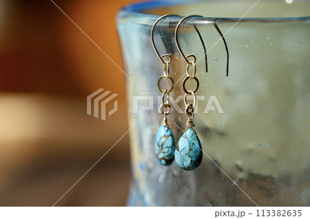 琉球ガラスに引っ掛けたコッパーターコイズのフックピアス 天然石ピアス
