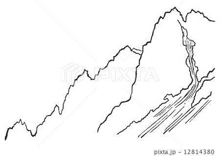 Hand drawn graphic vector illustration of abstract mountain landscape with snowcapped triangular peak and sharp mount range silhouettes