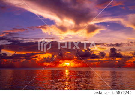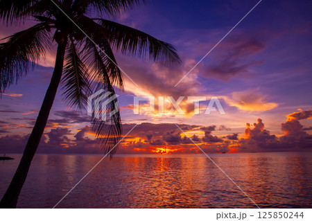 オセアニア・ポリネシアの島国ツバル 首都のフナフティ環礁フォンガファレ島のラグーンに沈む夕陽と夕焼け