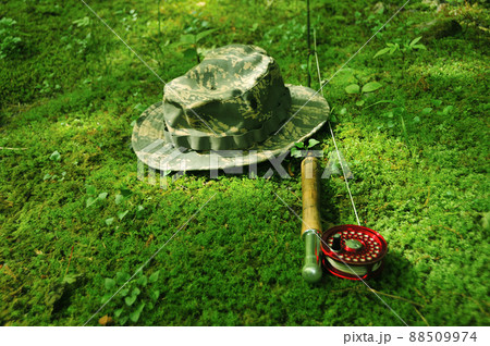 苔むした岩の上に置いたフライタックル