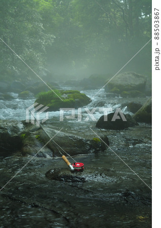 渓流に置かれたフライタックル