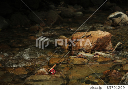 渓流においてあるフライタックル