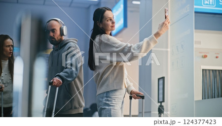 Crowded International Airport Terminal: Beautiful Woman Takes Selfie on Smartphone