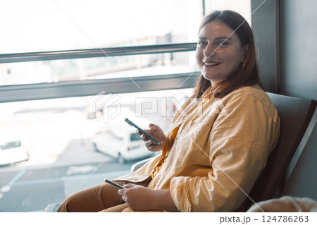 Young woman in the airport terminal using smartphones while waiting for her flight.