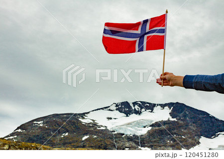 Hand holds norwegian flag against mountain nature