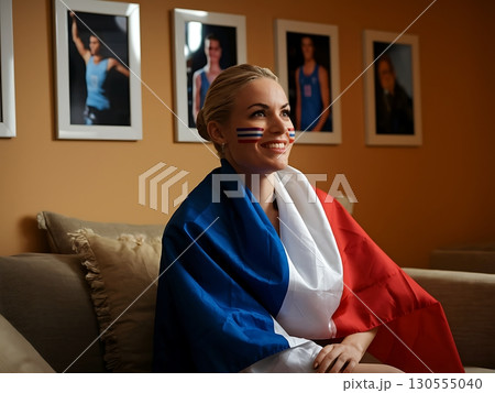 A woman draped in a flowing French flag, smiling