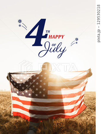 Celebrating Independence Day with an American flag at sunset in a wheat field