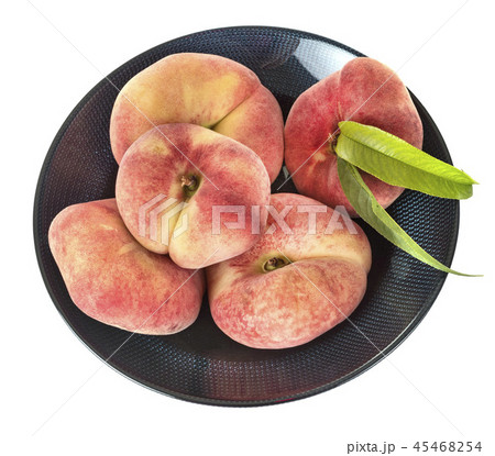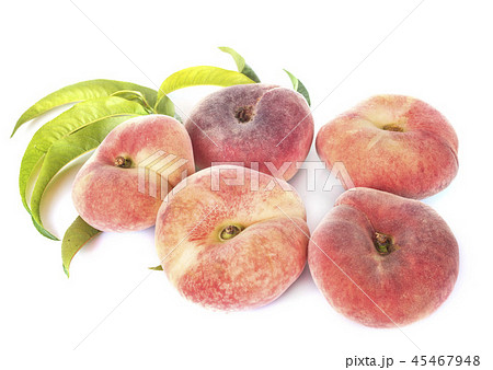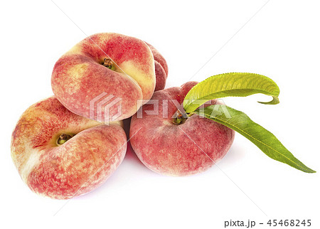 Ripe chinese flat peach fruit and half with leaf isolated on white background. Top view. Flat lay