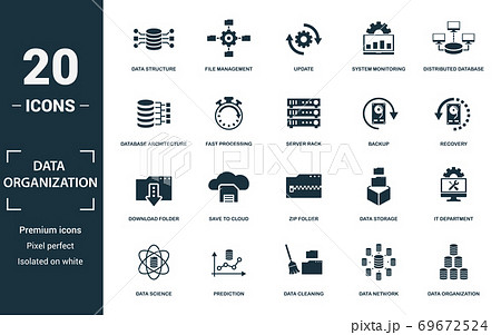 Data Organization icon set. Collection of simple elements such as the data structure, file management, update, system monitoring. Data Organization theme signs