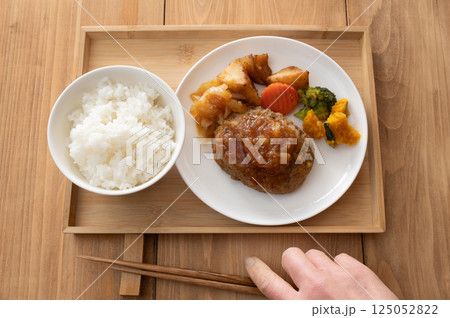 ご飯と玉ねぎソースのハンバーグに野菜のソテーが添えられたプレート