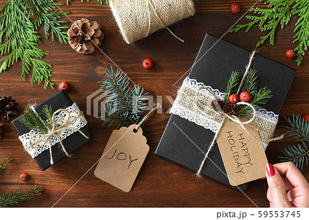 ナチュラルデザインの包装 クリスマスギフトラッピングと赤いマニキュアの女性の手