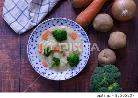 お皿に盛られたクリームシチューとその材料の俯瞰