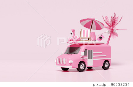 3d summer travel with beach chair, flamingo, ball, coconut palm tree, surfboard, umbrella, car van, camera isolated on pink background. concept, 3d render illustration
