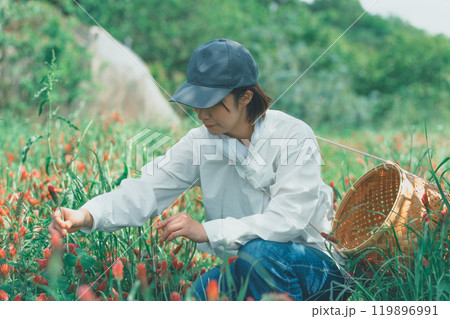 サポナリアを摘む女性