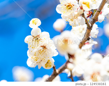 春の訪れを告げる満開の清楚な白梅 紅梅を背景に