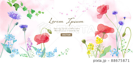 色々な花が咲き乱れる、春の野原の水彩イラスト。バナー背景。