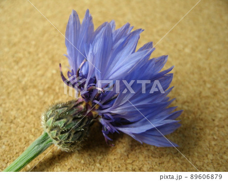 コルクボードの上のヤグルマギクの青紫色の花を乗せて