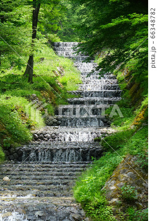 日本 長野県松本市にある新緑に囲まれた牛伏川フランス式階段工