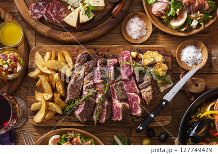 Seafood paella, shrimp and mussels risotto, rice, homemade, top view, no people,