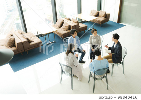 フリースペースのテーブルでミーティングをする爽やかな若手ビジネスマン