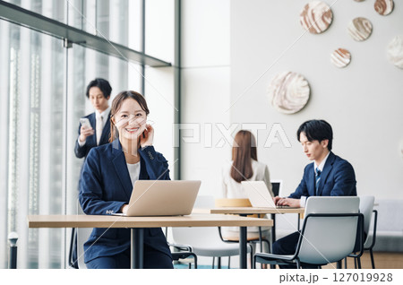 オフィスのフリースペースで仕事をするキャリアウーマン