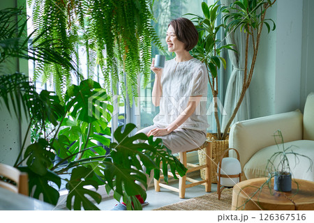 ライダーズカフェで一息、バイクを眺める女性ライダー