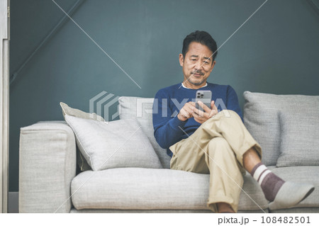 ソファに座ってスマホを操作する50代の男性