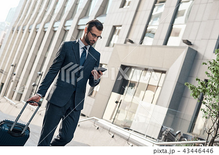 Busy working day. Side view of stylish and confident bearded businessman in formal wear is talking
