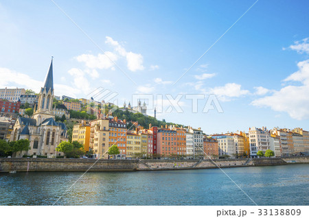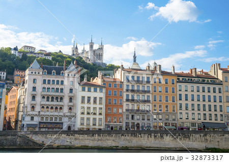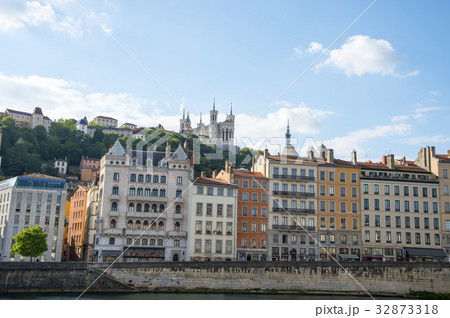 ソーヌ川沿いのカラフルなアパートメントとフルビエールの丘とノートルダム大聖堂