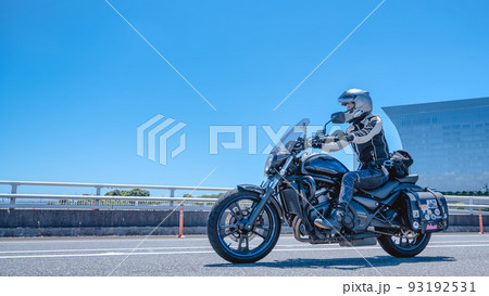 大型アメリカンバイクで横浜をツーリングする女性ライダーのイメージカット