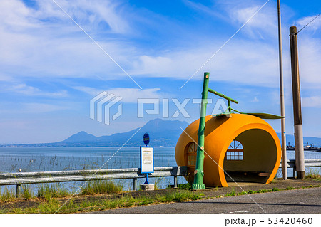 フルーツバス停 平原バス停 遠望は島原半島雲仙普賢岳 長崎県諫早市小長井町