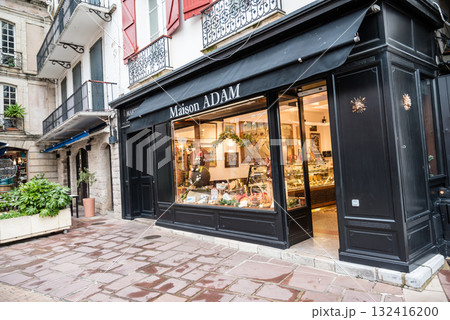 歴史的な並ぶ街並みの店先に置かれた椅子とテーブル フレンチバスク地方のサン・ジャン・ド・リュズにて