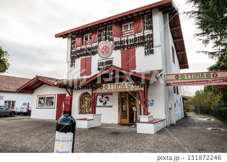 フレンチバスク地方の唐辛子で有名なエスプレット村の唐辛子の飾りが付いた赤と白の建物