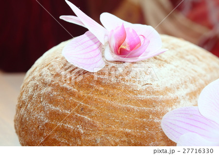 Rustic bread. Fresh loaf of rustic traditional bread with wheat grain ear or spike plant on linen texture background. Rye bakery with crusty loaves and crumbs. Concept - Cooking at Home.